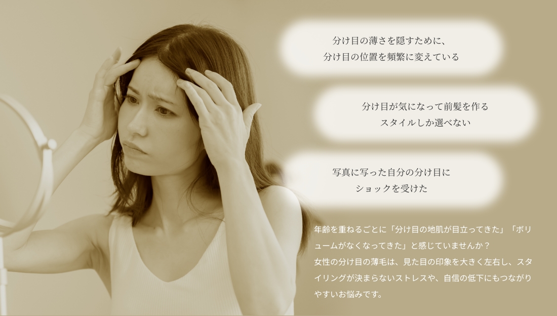 分け目の幅が明らかに広がり、髪が細くなっているのを実感します。ヘアスタイルにボリューム感がなくなり、地肌の露出も増えます。